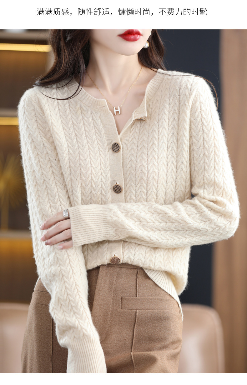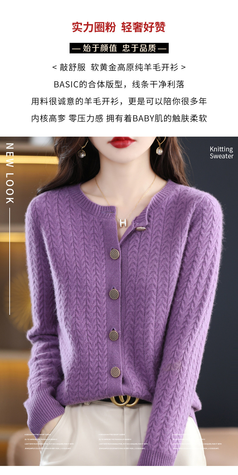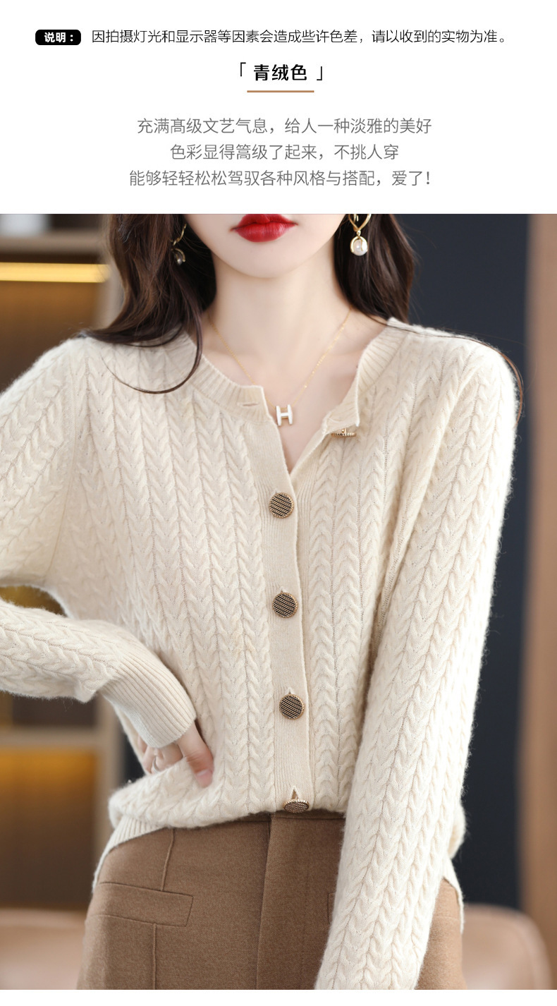2025 New 100% wool round neck Fried Dough Twists metal button cardigan solid loose knit versatile top*
