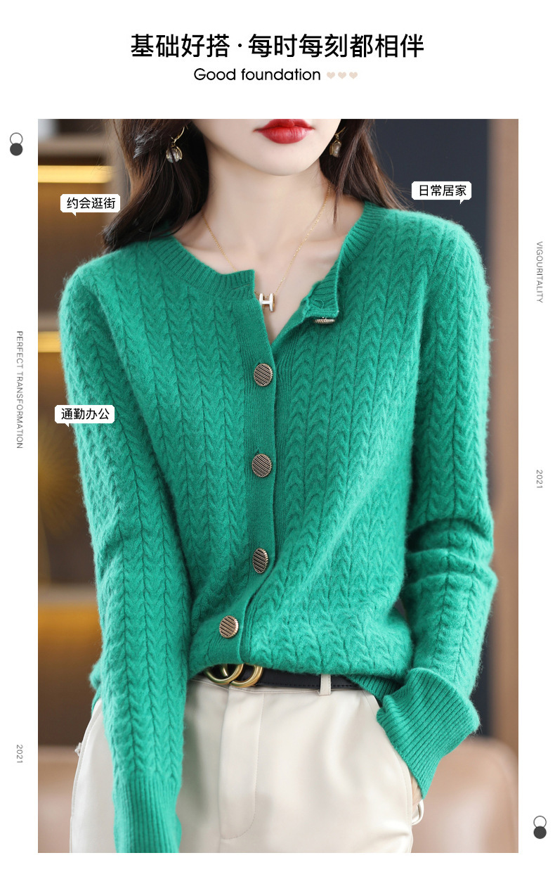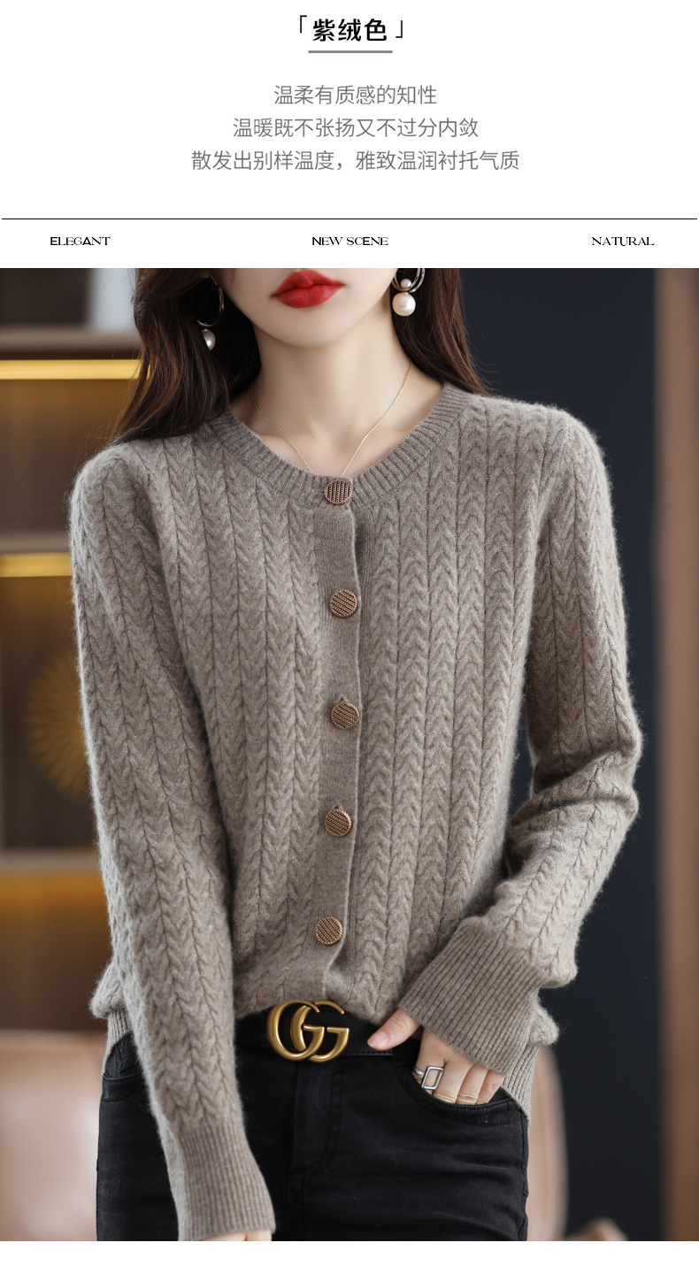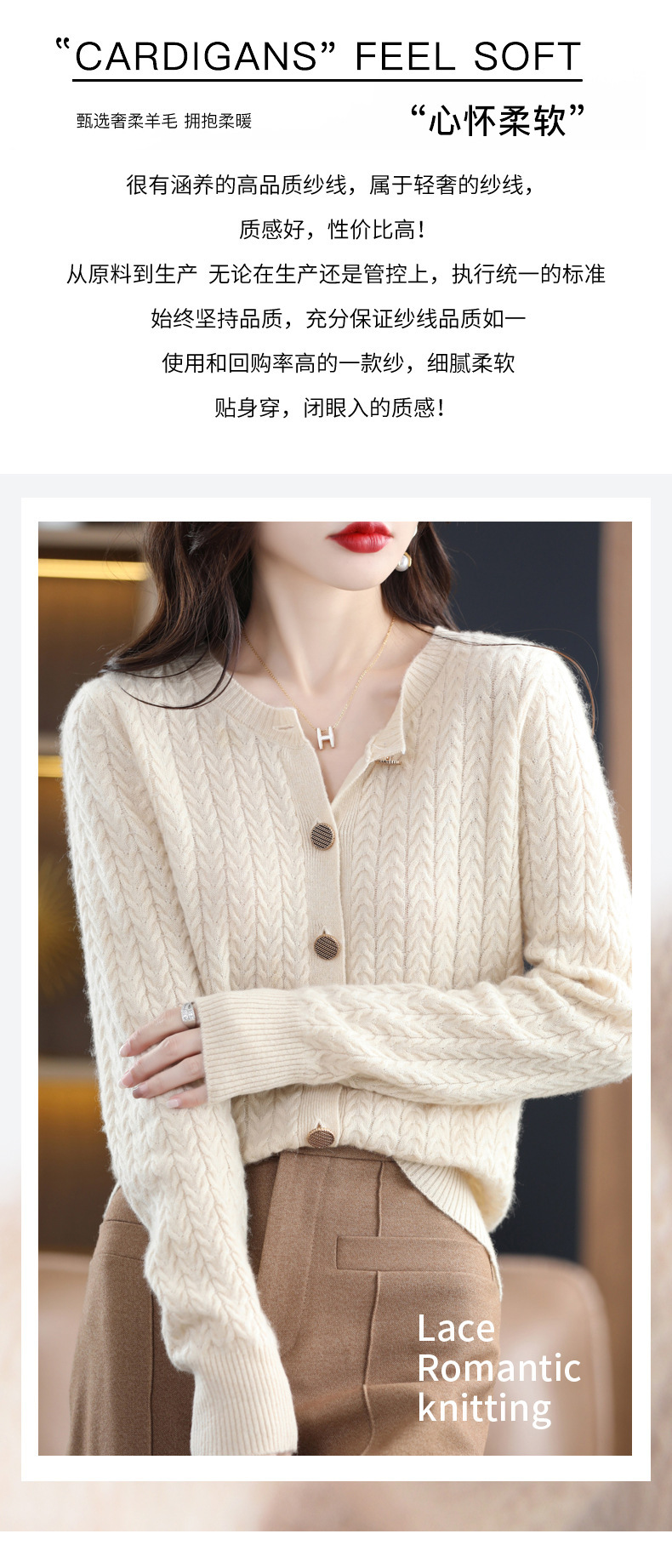 2025 New 100% wool round neck Fried Dough Twists metal button cardigan solid loose knit versatile top*